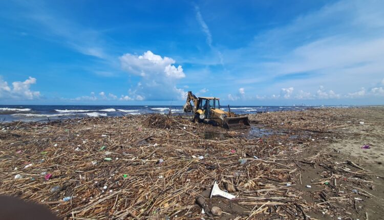 Personal de la dirección de Obras Públicas del gobierno de Coatzacoalcos llevó a cabo labores de limpieza en las playas del municipio, tras el recale de diversos animales muertos a consecuencia de las fuertes lluvias e inundaciones registradas en el norte del Veracruz.