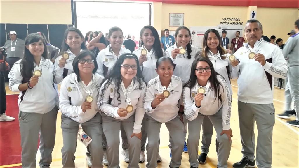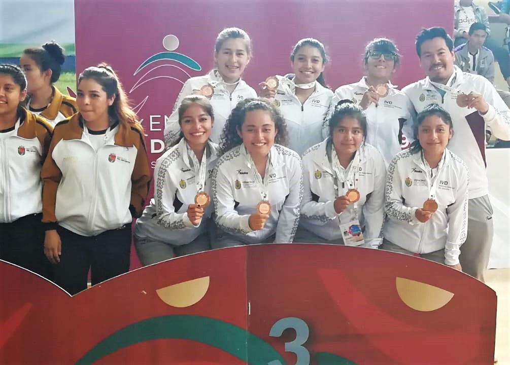 Las integrantes que ganaron la medalla de bronce son Andrea Morgado Pérez, Cristel Yatziri García Escoffi, Alejandra Daniela Paz Rodríguez, Andrea Xicalhua Chimalhua, Aura Mariana Larrios Espinosa, Elizabeth Tzompaxtle Quiahua, Lendy Ariadna Cueyactle Xochicale, Shivana América Xochicale Tequiliquihua, Soledad Cueyactle Colohua y Pamela Ibarra Ocmapo, bajo la instrucción de Gamaliel Timoteo García Pardo como entrenador.