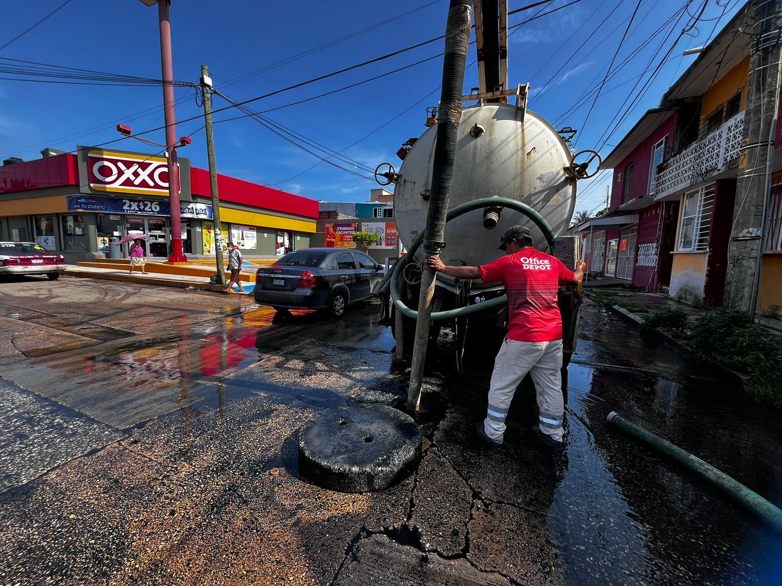 Esta mañana, la unidad Vactor llevó a cabo sondeos y desazolves en la línea sanitaria de la avenida Cristóbal Colón con Fernando de Córdoba. Este trabajo tiene como objetivo asegurar que las aguas residuales fluyan correctamente hacia el cárcamo, evitando así que se derramen en las calles y avenidas principales del sector.