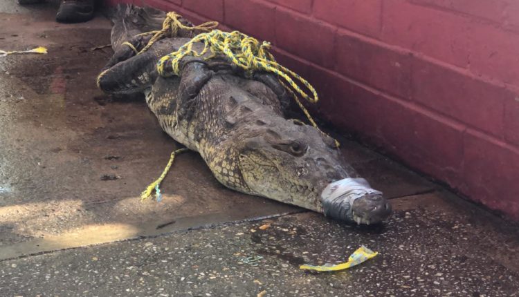 Un cocodrilo de más de dos metros de largo y 80 kilogramos que merodeaba la zona industrial de Coatzacoalcos fue capturado esta mañana por personal de Protección Civil.