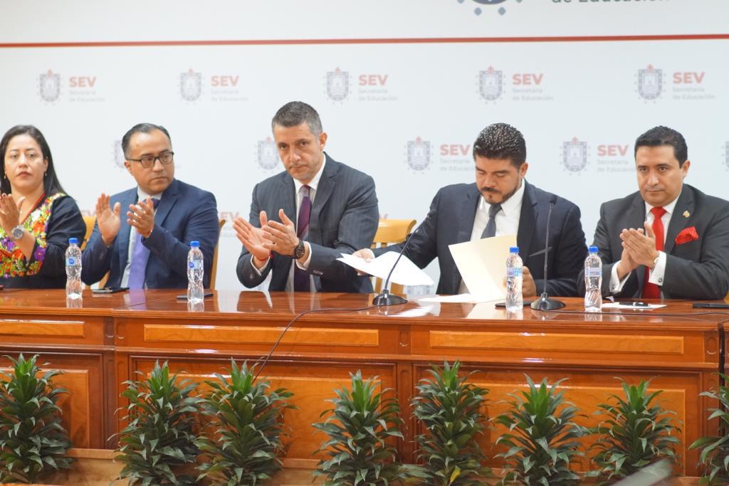 De igual forma, felicitó a José Miguel Hernández Durán, director jurídico de la SEV, y a René Cano Ariza, jefe del Departamento Patrimonial, por la gran labor realizada dentro del programa “Escuela Garantizada, Escritura Garante”, sumar al Colegio de Notarios y a las autoridades municipales para brindar certeza jurídica a los planteles educativos.