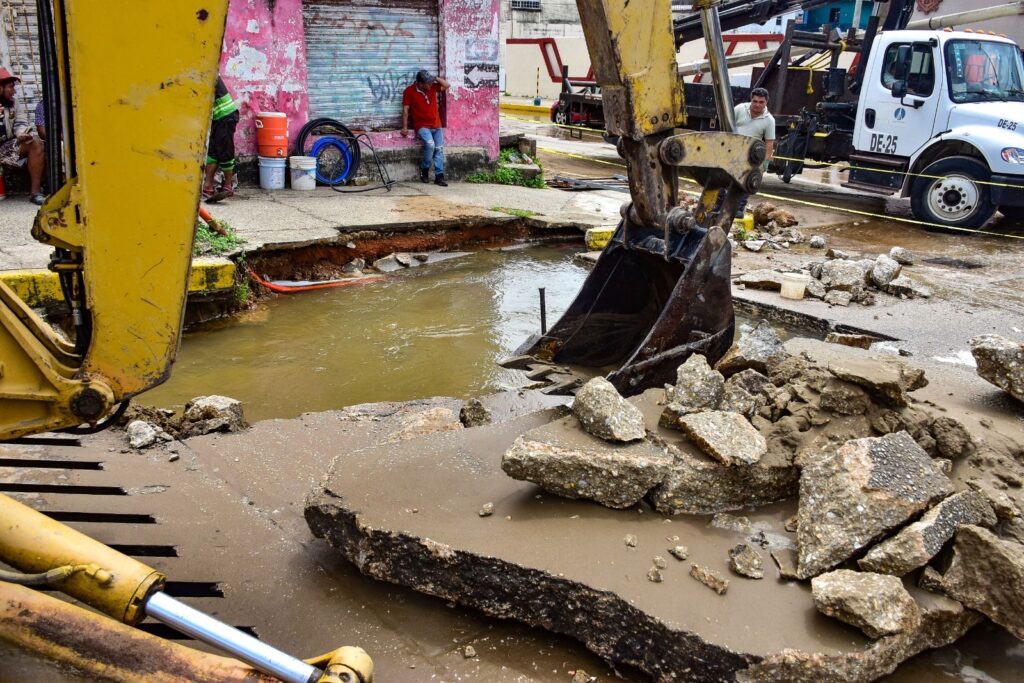 En esta área ubicada en los Esfuerzos de los Hermanos del Trabajo se requirió la demolición de la losa y el apoyo de maquinaria pesada para la rehabilitación del área, por lo que se labora para normalizar el servicio de agua potable y se exhorta a circular con precaución.