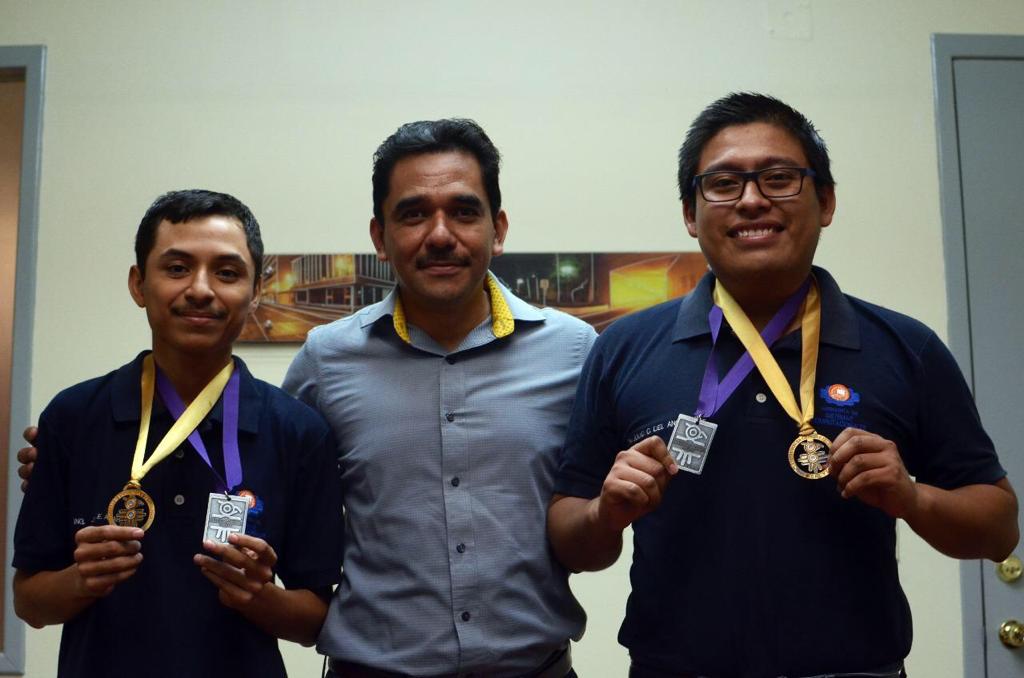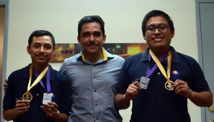 Los jóvenes portan las preseas de platino obtenidas en el Concurso Infomatrix, en la versión regional realizada en Tuxpan; su pase al certamen internacional de Ecuador, donde ganaron la medalla de oro al medirse con proyectos de otros seis países.