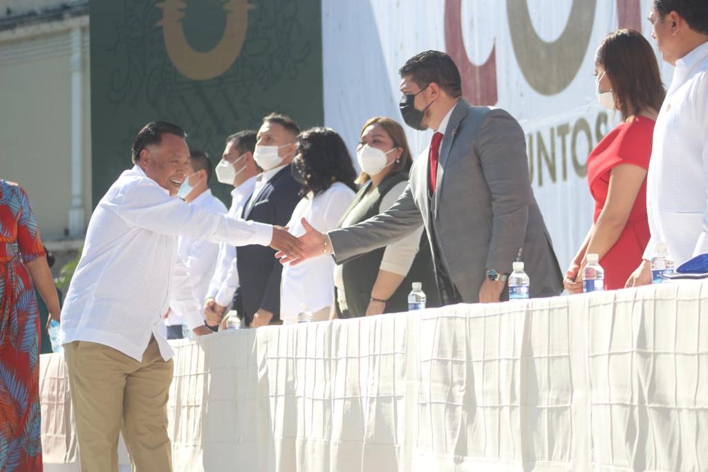 En Río Blanco, en la plazuela José Azueta, ante el nuevo Cabildo encabezado por Ricardo Pérez García, el funcionario estatal reiteró su compromiso por coadyuvar a impulsar la educación.
