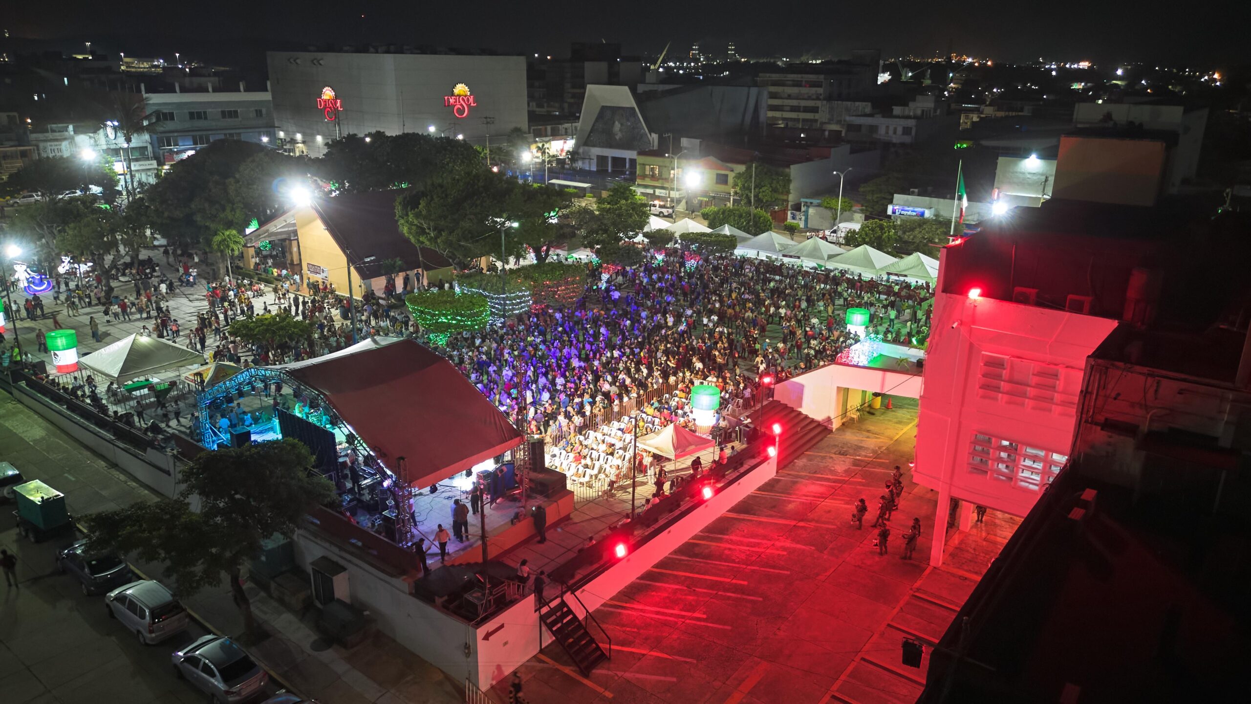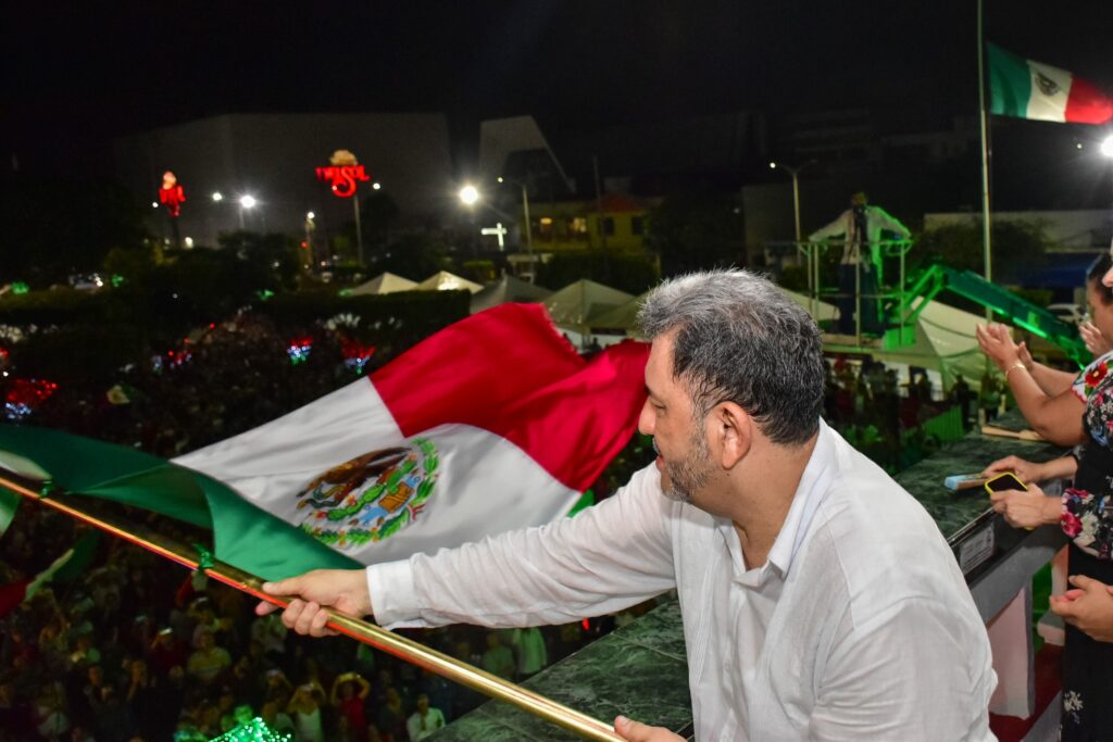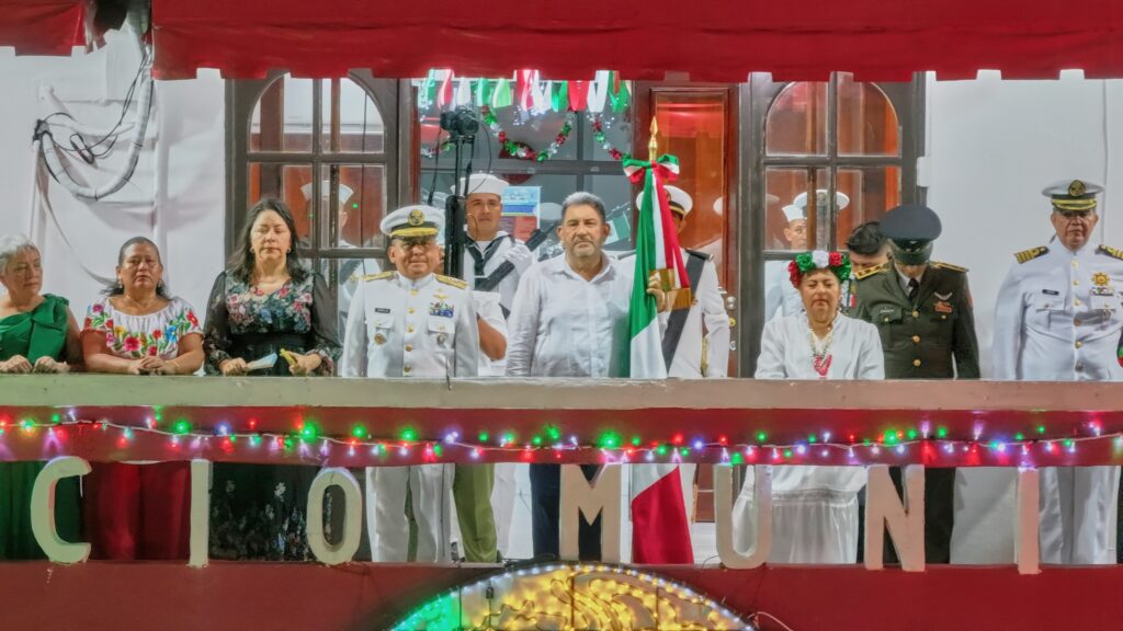 Como parte del acto cívico, la Síndico Único, Ana Bertha Hernández Aguilar, entregó el lábaro patrio a la escolta de la Séptima Zona Naval. Posteriormente, el alcalde, acompañado de la presidenta del DIF Municipal, Esther Mortera Zetina, regidores y autoridades estatales, repicó las campanas de la libertad y pronunció las arengas enalteciendo a los héroes que nos dieron patria y el ¡Viva México!.