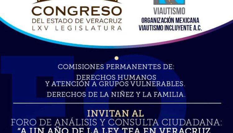 Este miércoles 4 de septiembre, en el Palacio Legislativo, se llevará a cabo el Foro de Análisis y consulta Ciudadana “A un año de la Ley TEA en Veracruz, avancemos hacia el reglamento”, a iniciativa de la organización mexicana Viautismo Incluyente AC, con el respaldo de las Comisiones Permanentes de Derechos Humanos y Atención a Grupos Vulnerables y de Derechos de la Niñez y la Familia.