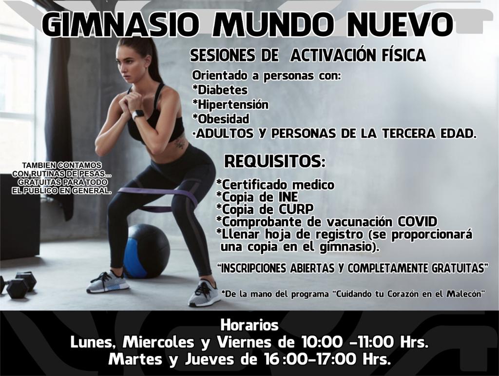 En el gimnasio municipal de “Mundo Nuevo”, se pretende fomentar entre la ciudadanía y comunidad deportiva, el ejercitarse para mejorar su salud, del mismo modo se les practicarán chequeos periódicos de salud de la mano de las actividades de “Cuidando tu Corazón en el Malecón”, además de que se les proporcionará un programa de acondicionamiento físico de acuerdo a su edad.