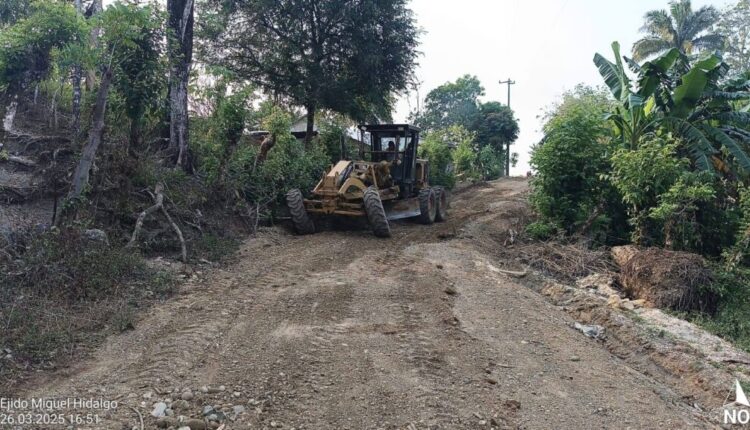 El ejido Miguel Hidalgo se ubica a más de 50 kilómetros de la cabecera municipal, por lo que con el equipo y maquinaria propia del Ayuntamiento, se trabaja en el tendido de material, rastreo y cunetas del camino.