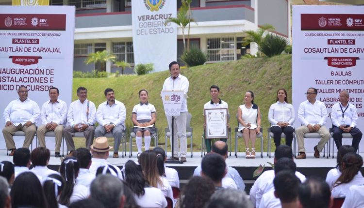 Al inaugurar el edificio del Plantel 52 del Colegio de Bachilleres del Estado de Veracruz (COBAEV), con sede en el barrio Pezoapan de este municipio, el gobernador Cuitláhuac García Jiménez invitó a los estudiantes a que aprovechen al máximo las instalaciones y a seguirse preparando para retribuir de conocimientos a la sociedad, alfabetizando, principalmente, a los adultos.