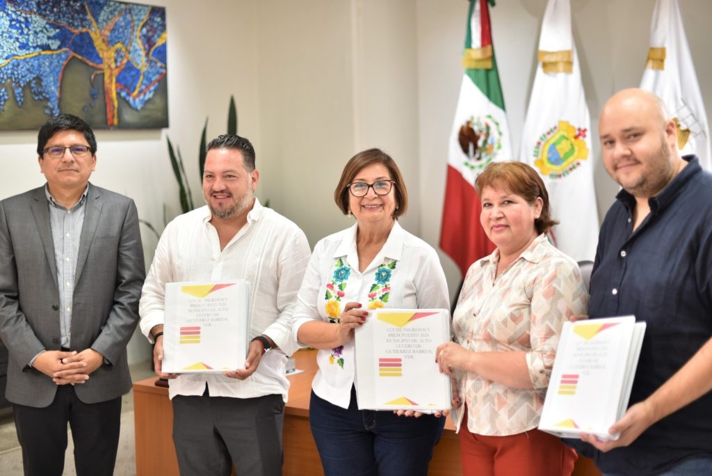 La legisladora Margarita Corro recibió del presidente municipal Luis Vicente Aguilar Castillo el proyecto de Ley de Ingresos y Presupuesto de Egresos 2024 del ayuntamiento de Alto Lucero de Gutiérrez Barrios; lo acompañaron la síndica, Celia Herrera Sánchez y el regidor segundo, Jorge Rivera Castillo.