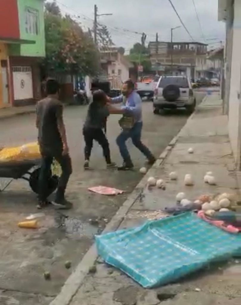 Ante el temor de perder su única fuente de ingresos, una carretilla con fruta de temporada, la vendedora y su hijo menor de edad sufrieron empujones y golpes.