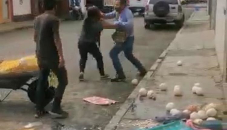 Ante el temor de perder su única fuente de ingresos, una carretilla con fruta de temporada, la vendedora y su hijo menor de edad sufrieron empujones y golpes.