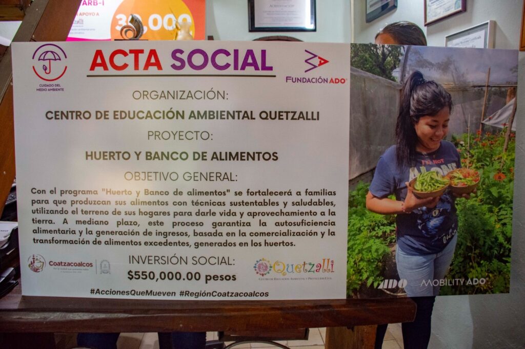 Así, el pasado viernes 31 de mayo, Fundación Quetzalli recibió de manos de representantes de Mobility ADO región Coatzacoalcos el Acta Social de recursos de inversión social, donde estipula 550 mil pesos para la ‘Instalación de Huertos y Banco de Alimentos Sustentable’.