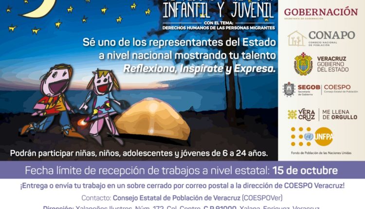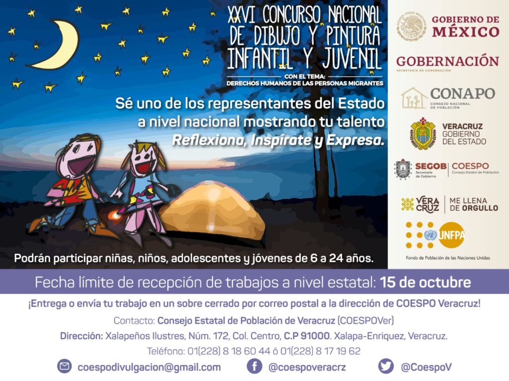 El Consejo Estatal de Población (COESPO) invita a niñas, niños, adolescentes y jóvenes, de seis a 24 años de edad, a participar en el XXVI Concurso Nacional de Dibujo y Pintura Infantil y Juvenil, que organizan el Consejo Nacional de Población (CONAPO) y el Fondo de Población de las Naciones Unidas (UNFPA) con el tema “Derechos humanos de las personas migrantes”.