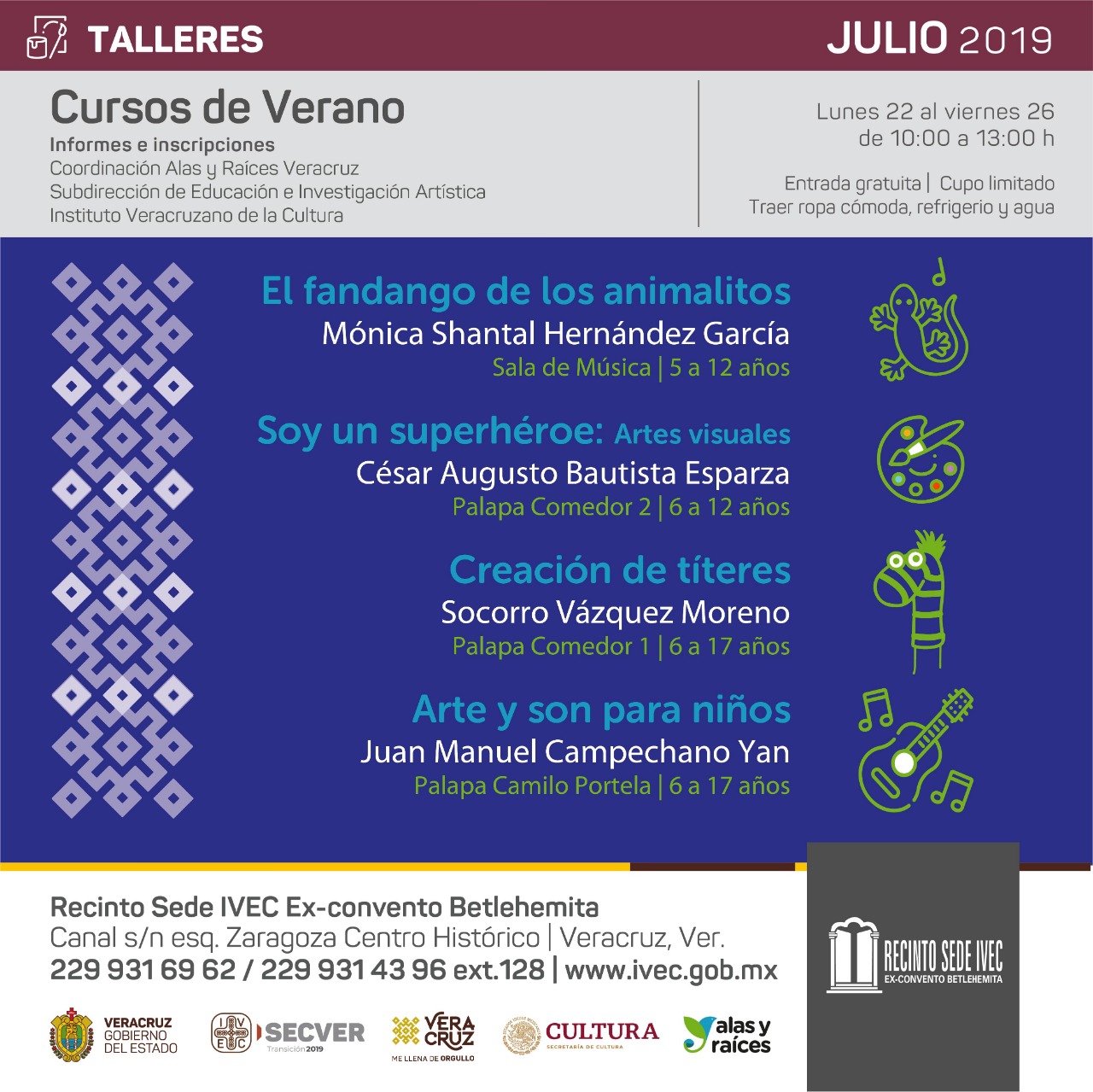 Del 22 al 26 de julio, en el Recinto Sede IVEC Ex Convento BetlehemitaXalapa, VeracruzEn CoatzaEl Instituto Veracruzano de la Cultura (IVEC) y la Coordinación Estatal de Desarrollo Cultural Infantil “Alas y Raíces Veracruz” invitan al público de los pequeños y adolescentes, a asistir este verano a los cuatro cursos que se realizarán de manera simultánea en el Recinto Sede Ex Convento Betlehemita, en la ciudad de Veracruz del 22 al 26 de julio, de 10:00 a 13:00 horas.Los temas son: El fandango de los animalitos; Soy un superhéroe: Artes Visuales; Creación de títeres y Arte y Son para niños. Las actividades son juegos, maquetas, creación de cómic, dibujos, círculos de lectura, títeres y piñatas, las cuales tienen el objetivo de fomentar la educación artística en las niñas, niños y adolescentes, así como estimular su creatividad y desarrollar sus habilidades cognitivas y sociales a través de música, danza, teatro y artes plásticas.Los cursos son gratuitos, sólo se requiere previa inscripción. Se llevarán a cabo en espacios cerrados y abiertos, por lo que se recomienda a los participantes traer ropa cómoda, agua y un refrigerio.Para mayores informes e inscripciones, comunicarse a los teléfonos 229 931 69 62 y 229 931 43 96 Ext. 128 o consultar la página www.ivec.gob.mx y Facebook @institutoveracruzano.delacultura.
