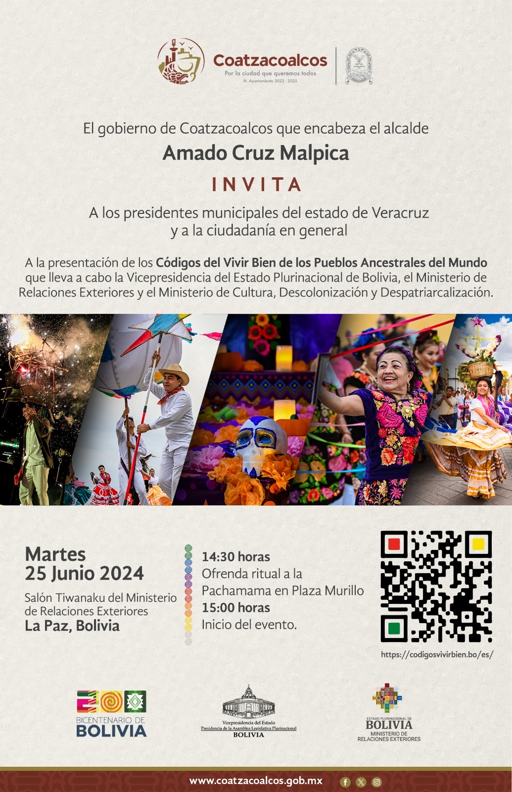 El presidente municipal, Amado Cruz Malpica, invitó a los alcaldes del sur de Veracruz y al público en general a disfrutar de la presentación vía zoom del programa ‘Códigos del Vivir Bien de los Pueblos Ancestrales del Mundo’ que realiza la Vicepresidencia del Estado Plurinacional de Bolivia.