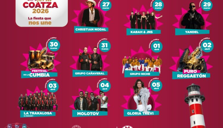 Del 27 de marzo al 5 de abril, se vivirá la “Expo Feria Coatza 2026”, la fiesta más grande del sur de Veracruz, que reunirá a artistas de talla internacional como Christian Nodal, Kabah, JNS, Yandel, La Trakalosa, Molotov y Gloria Trevi, además de talentos locales y regionales, en un programa pensado para todos los gustos y edades.