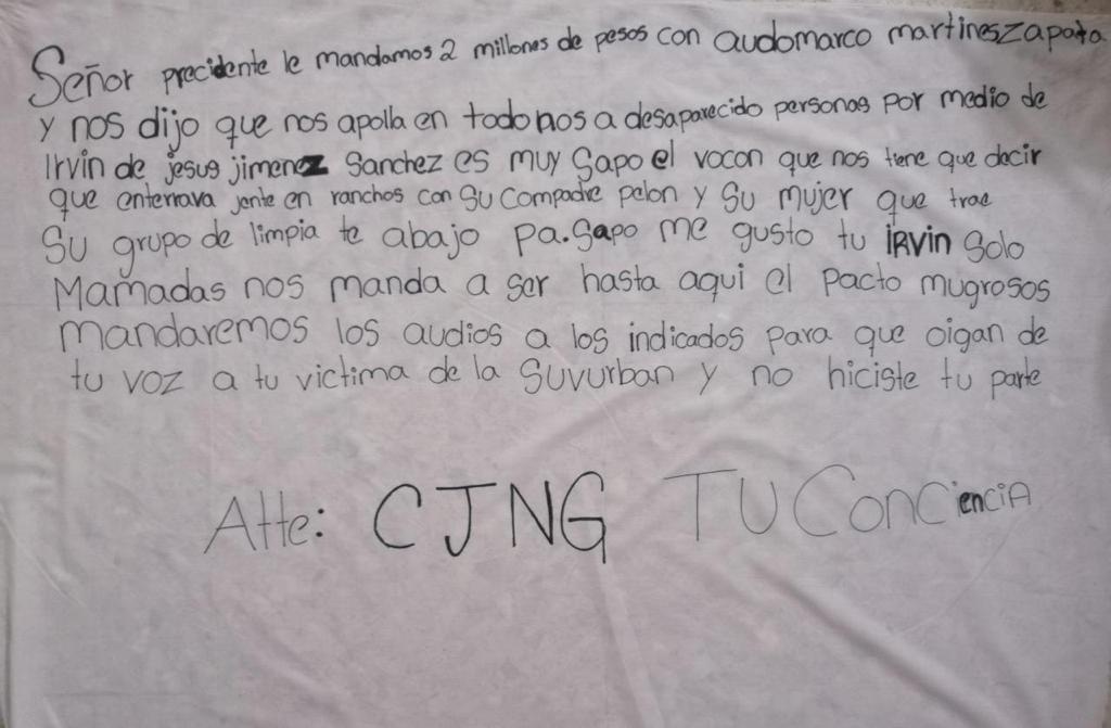 El mensaje señala de manera textual: “señor precidente le mandamos 2 millones de pesos con audomarco Martínez Zapata y nos dijo que nos apoya en todo nos ha desaparecido personas por medio de Irvin de Jesús Jiménez Sánchez es muy sapo el vocón que nos tiene que decir que enterrava jente en ranchos con su compadre pelón y su mujer que trae su grupo de limpia te abajo pa.sapo me gustó tu Irving sólo mamadas nos manda a ser hasta qui el pacto mugrosos mandaremos los audios a los indicados para que oiga de tu vos a tu víctima de la Suvurban Y no hiciste tu parte.
