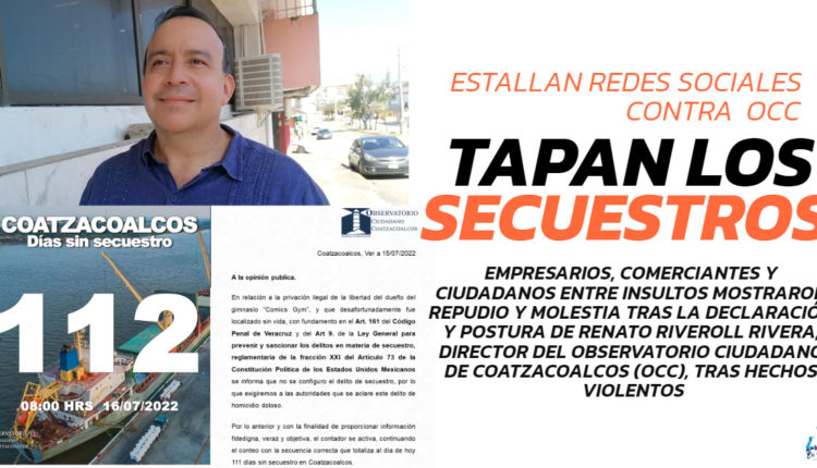 Empresarios, comerciantes y ciudadanos entre insultos mostraron repudio y molestia tras la declaración y postura dada por parte de Renato Riveroll Rivera, director del Observatorio Ciudadano de Coatzacoalcos (OCC), luego de que esta semana se vivieron varios hechos violentos, como secuestros, homicidios, cobro de piso, extorsión, cierres de negocios y otros delitos que no son denunciados por temor a la integridad física.