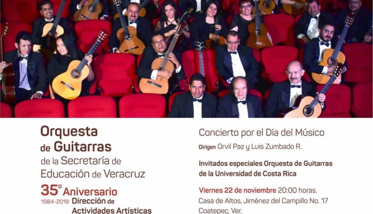 Con motivo de la celebración del Día del Músico, la “Orquesta de Guitarras” de la Secretaría de Educación de Veracruz (SEV), y la “Orquesta de Guitarras” de la Universidad de Costa Rica, se presentarán este viernes 22 de noviembre en Coatepec.