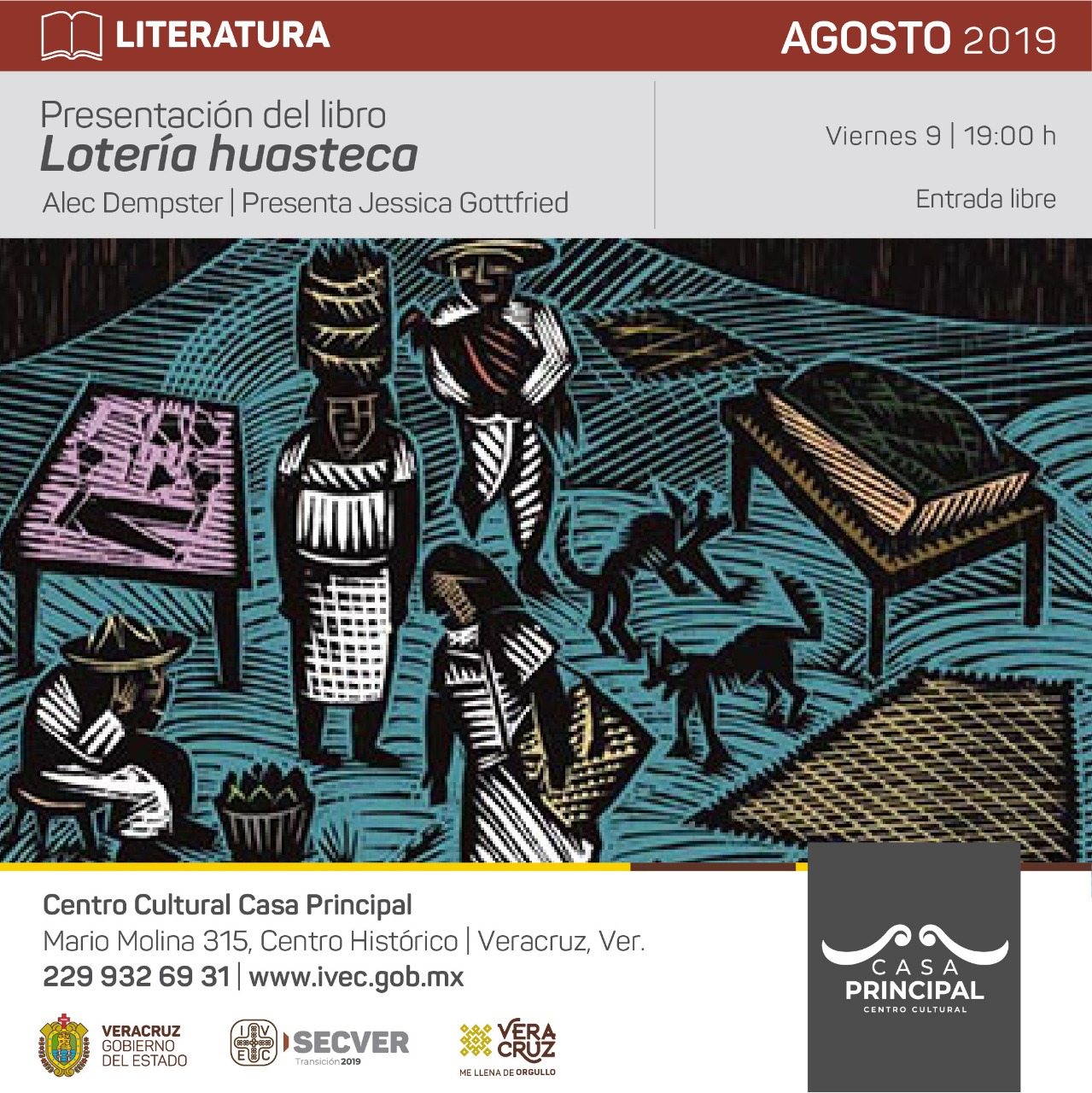 Tallados hechos en madera componen este nutrido cosmos lingüístico y culturalXalapa, VeracruzEn CoatzaEl Instituto Veracruzano de la Cultura (IVEC) informa que será presentado el libro _Lotería huasteca_, travesía gráfica de 54 grabados y textos de Alec Dempster, este viernes 09 de agosto a las 19:00 horas en el Centro Cultural Casa Principal. La entrada es libre.Alec Dempster, multifacético con sus actividades, es músico, artista gráfico y viajero, y pronto incursionará en la diversidad cultural de otras formas del arte; es autor también de los libros _Lotería jarocha_ y _La jarana de Mario_._Lotería huasteca_ integra una serie de grabados ingeniosos sobre diversos temas enmarcados en el entorno natural y cultural actual de este grupo, tanto de los pueblos indígenas como de los mestizos que la habitan. Son representaciones gráficas de una selección variada de animales, platillos típicos, utensilios y herramientas, espacios y giros laborales, artesanías, religión y música.Así, La acamaya, El amate, El bocol, El caimán, La casa, El cerro, El chichapal, El chiquihuite, El cotorro, La curandera, La danza, El trovador, La siembra, El huapango, El mapache, La jarana, entre otros, son los tallados hechos en madera que componen este nutrido cosmos lingüístico y cultural.El artista estará acompañado de la investigadora Jessica Gottfried Hesketh, responsable del Archivo Histórico del Centro Nacional de Investigación, Documentación e Información Musical Carlos Chávez (CENIDIM).