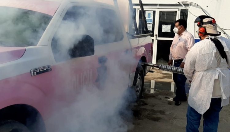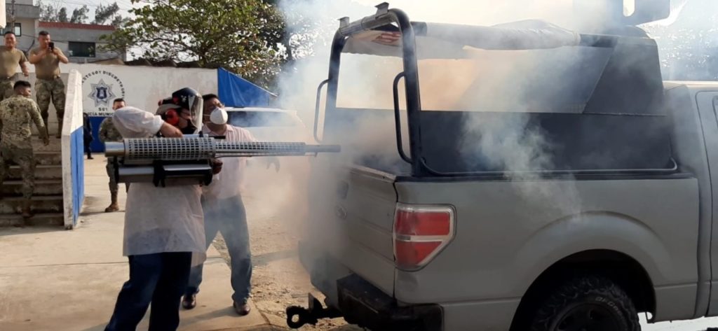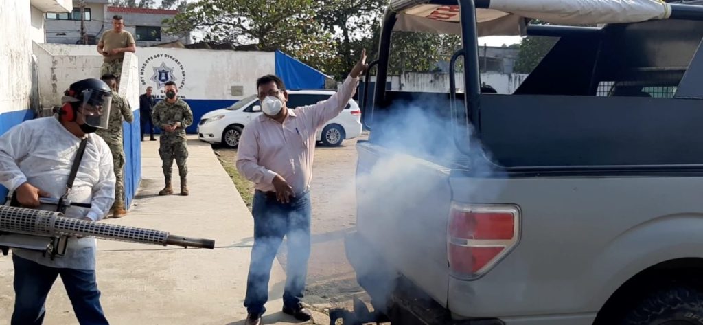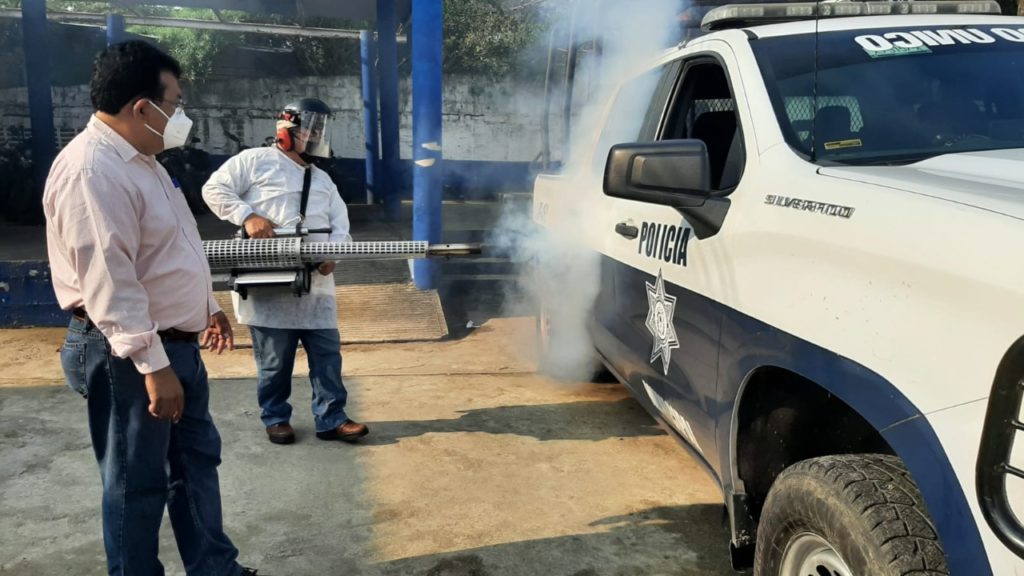 Atendiendo las peticiones de las áreas, se realizaron acciones de desinfección en las instalaciones de la Policía Municipal y la Policía Estatal.