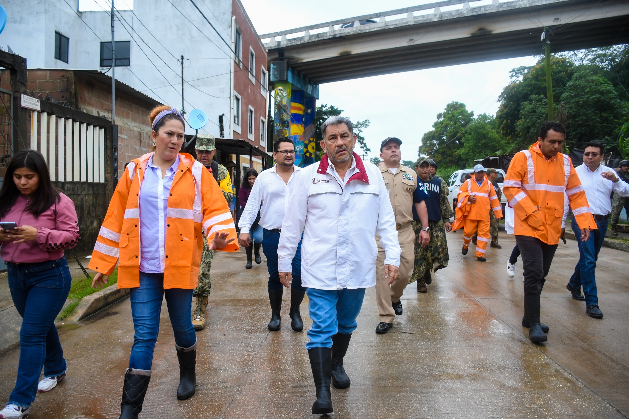Las autoridades realizaron un recorrido por tres zonas de atención prioritaria para evaluar los riesgos y brindar asistencia en las áreas afectadas por deslaves e inundaciones. El primer punto fue en la colonia Héroe de Nacozari, donde se desbordó el canal a cielo abierto en la intersección de las calles Leona Vicario y Santa María de la Rivera, donde se utilizaron unidades RAM 4X4 del Ejército Mexicano para ingresar.