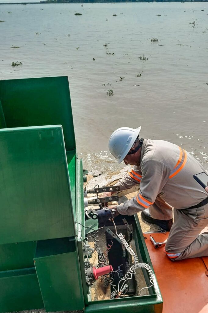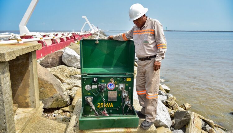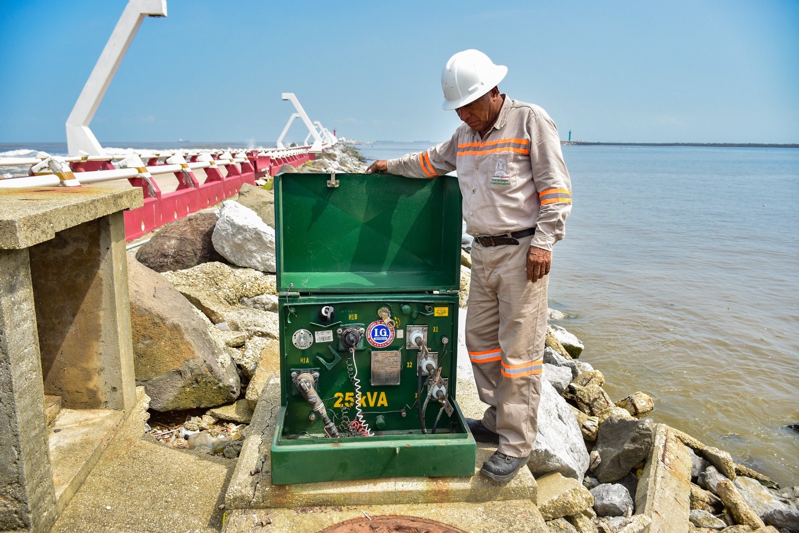 La subdirección de Alumbrado Público intensificó los trabajos de rehabilitación del sistema de luminarias de las escolleras de Coatzacoalcos, un esfuerzo destinado a mejorar la seguridad y el disfrute de esta importante zona turística.