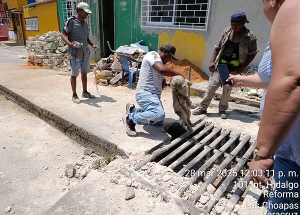RESCATAN A “LOMITO” QUE CAYÓ A ALCANTARILLA EN LAS CHOAPAS