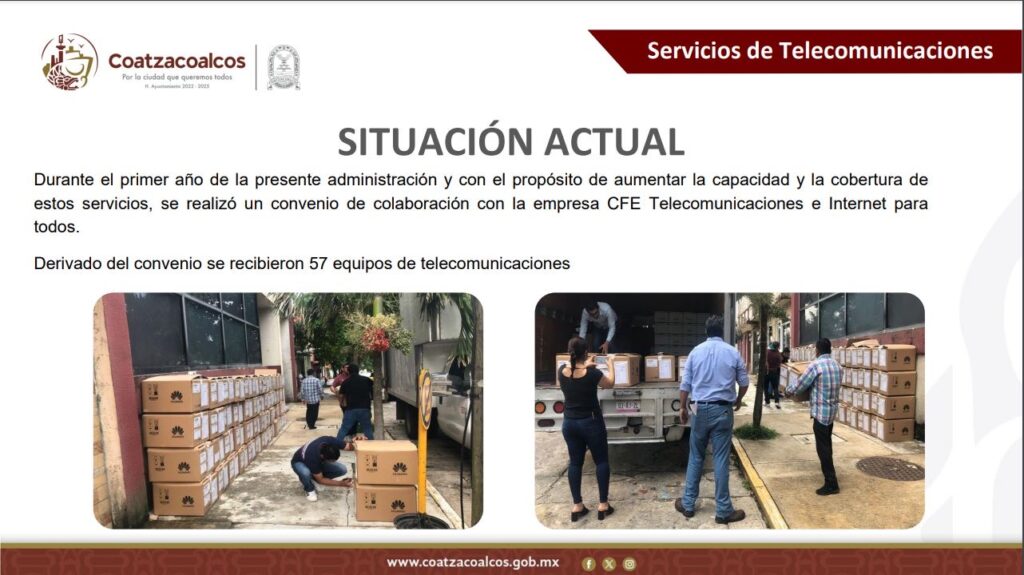 Derivado del convenio se recibieron 57 equipos de telecomunicaciones colocados por personal de Innovación en coordinación con la Subdirección de Alumbrado Público y fueron situados en 15 puntos del municipio como parques y bibliotecas.