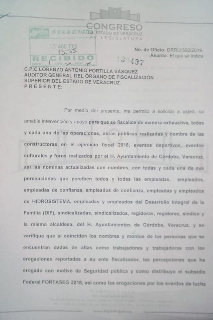 El diputado local Rubén Ríos Uribe solicitó al Órgano de Fiscalización Superior del Estado (ORFIS), realice auditorías exhaustivas al Ayuntamiento de Córdoba, Sistema Municipal DIF, COMUDE y al organismo paramunicipal Hidrosistema de Córdoba, ante la opacidad en su manejo financiero y presupuestal así como el exorbitante gasto corriente reportado mes con mes en sus Estados Financieros.