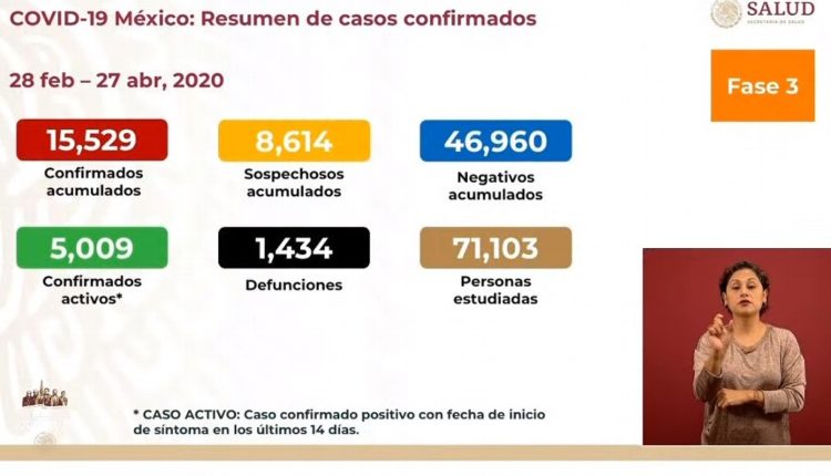 El director de Epidemiología de la Secretaría de Salud federal, José Luis Alomía Zegarra, informó que hasta este lunes 27 de abril en México suman mil 434 fallecimientos a causa de Covid-19, así como 15 mil 529 casos positivos.