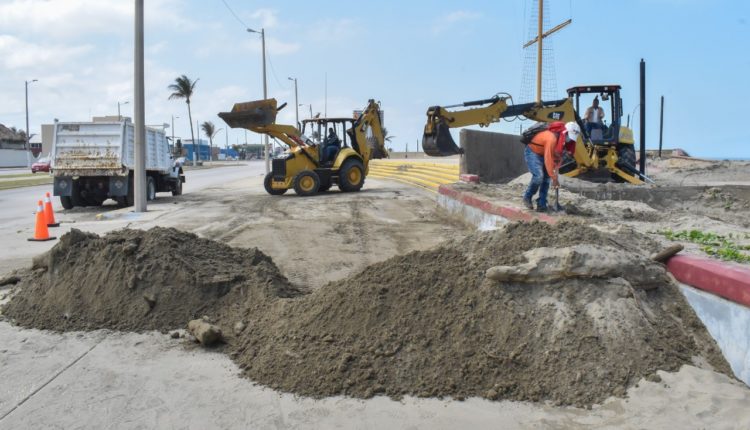 Por último, tras el paso del Frente Frío 26, tres cuadrillas de trabajadores retiraron arena acumulada de banquetas y arroyo vehicular del Malecón Costero, así como de las terrazas ubicadas en la playa, para colocarla nuevamente en el mar y evitar más montículos en este paseo turístico.
