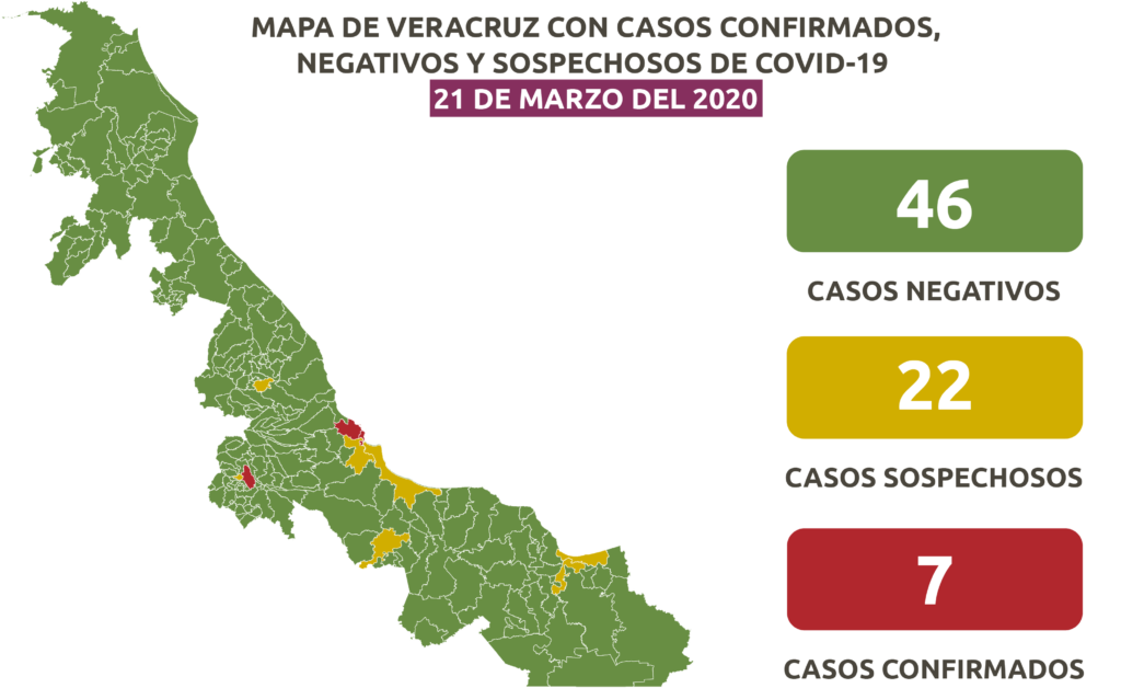 El número de positivos continúa en 7, de los que cuatro radican en Boca del Río, dos en Veracruz y uno en Ixtaczoquitlán; los pacientes de los dos primeros municipios están en cuarentena, asintomáticos, y al igual que sus contactos, con monitoreo diario hasta obtener el alta sanitaria.