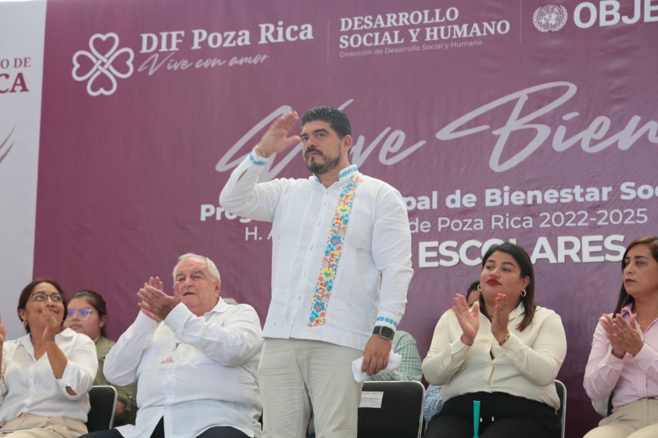 Al reconocer el esfuerzo del ayuntamiento de Poza Rica para destinar dos millones 500 mil pesos para la conformación y entrega de estos paquetes escolares, que beneficiarán a las y los alumnos de 92 planteles educativos y del CAM no. 21, el servidor público precisó que el trabajo colaborativo ofrece mayores beneficios a la ciudadanía y, en este caso, a las comunidades educativas.